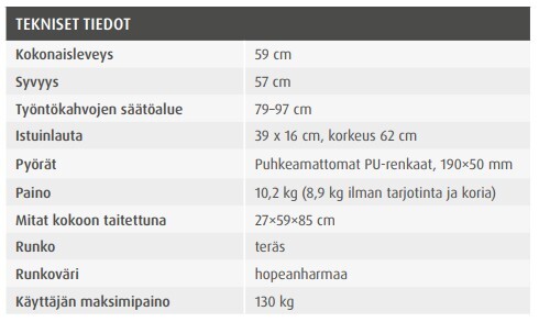 - Pyörät: puhkeamattomat PU renkaat, 150x90mm